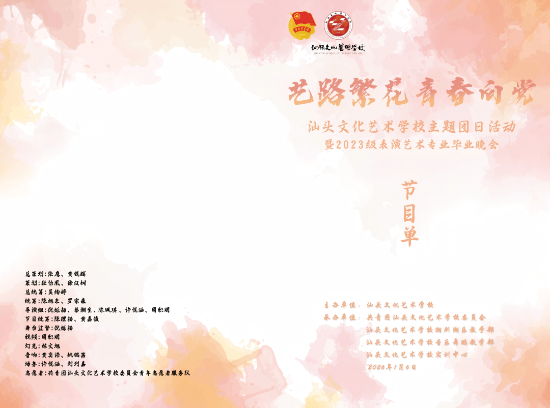 1月6日晚,汕头文化艺术学校举办了“艺路繁花·青春向党”主题团日活动暨2023级表演艺术专业毕业晚会。此次晚会汇聚学校潮剧、潮乐、舞蹈、声乐、钢琴等专业学子同台献艺,集中展现了学生在校期间的学艺成果,是我校深入学习贯彻党的二十大精神,落实“全面实施学校美育浸润行动”要求,以艺术实践筑牢青年文化自信的生动课堂。