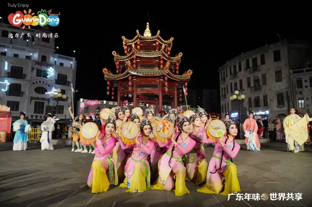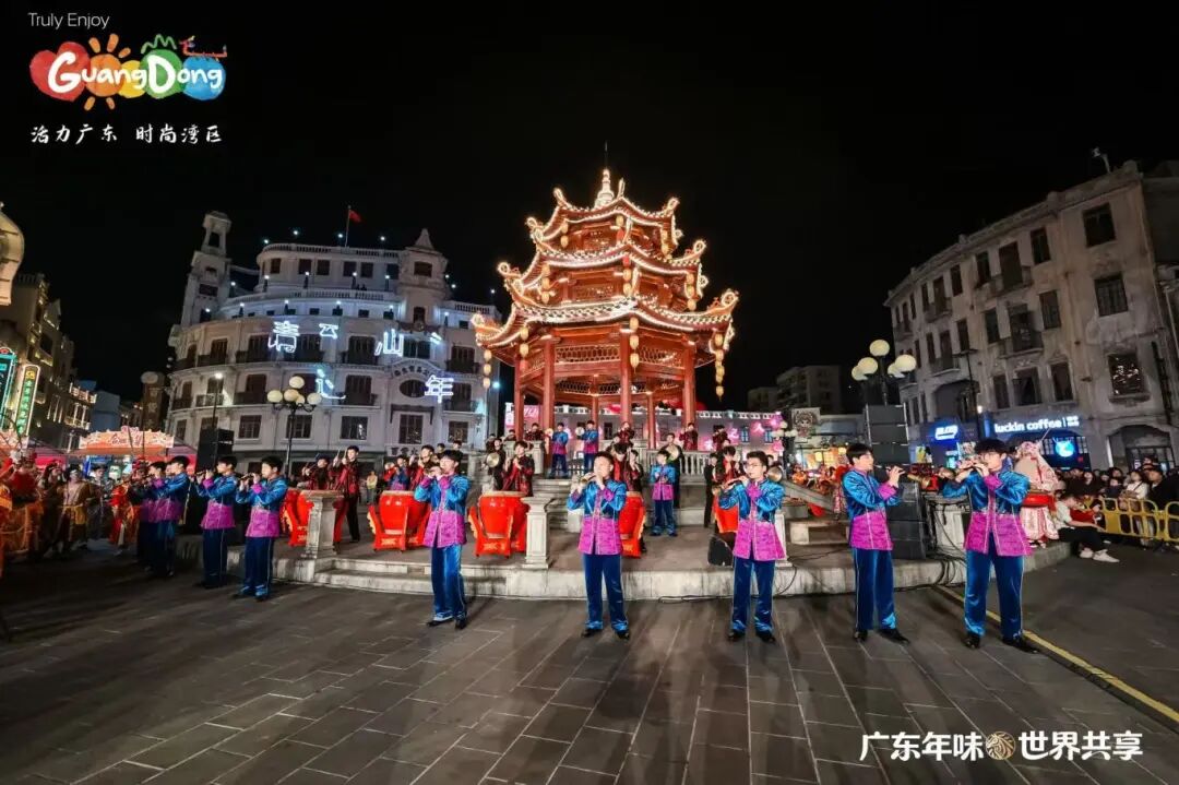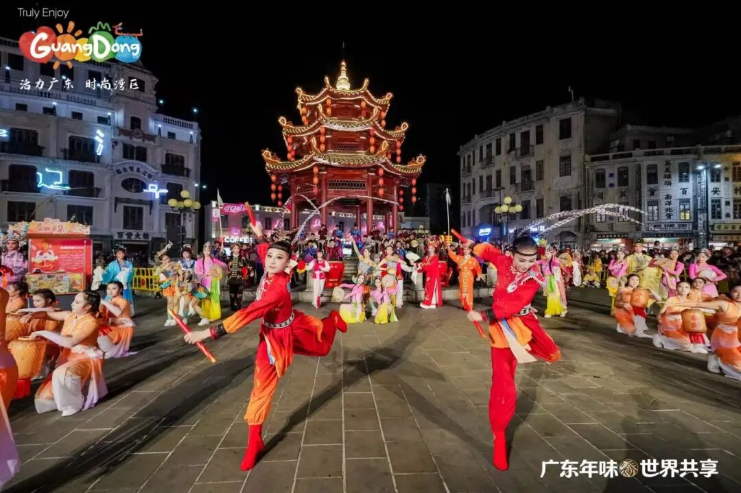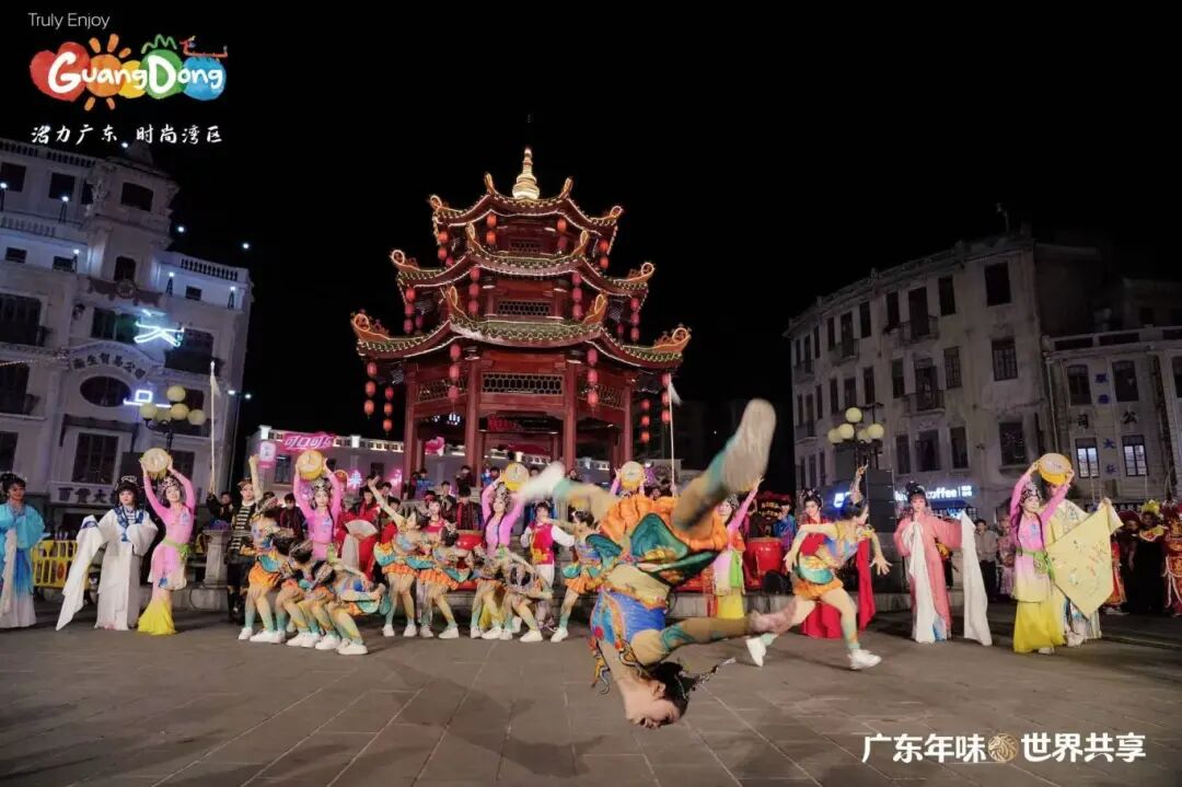 晚上,“广东年味·世界共享——请到广东过大年”新春活动之“小公园·大团圆”文艺快闪表演活动,在汕头市小公园中山纪念亭热烈上演。这是白天“请到广东过大年”主活动的延续和重要组成部分,与白天在主会场(镇邦美食街)的启动仪式和体验活动相比,这场晚间快闪更侧重于文艺表演、跨文化互动和情感升华,活动以快闪节目《潮聚·向汕》开场,这是一个沉浸式快闪,将英歌舞、潮剧、潮乐、潮汕民间舞蹈等传统潮汕非遗元素与现代快闪形式进行结合;第二个节目是由本土歌手李绪杰与两位外国友人同台演唱了《我爱潮汕小吃》,歌曲将潮汕美食的烟火气与跨文化交流的精彩瞬间融为一体;学校潮州音乐学生还表演了潮汕大锣鼓《火炮锣鼓乐》等;尾声,所有外国友人与演艺人员齐聚小公园的百货大楼前。在激光光影的映照下,“请到汕头过大年”的美好邀约被投射出来,众人共同定格了一张象征“小公园大团圆”的温馨合影,将活动气氛推向高潮,用光影定格的“大团圆”。活动由音乐舞蹈教学部主任吴绚婷担任总导演,舞蹈专业教师陈理扬担任执行导演,王渠音、黄嘉俊、陈国权、李晓帆、林炜豪、袁晓虹、倪烁扬、许悦涵、姚锶茜、周积明担任指导教师,陈树泉、姚立负责服装、道具工作。