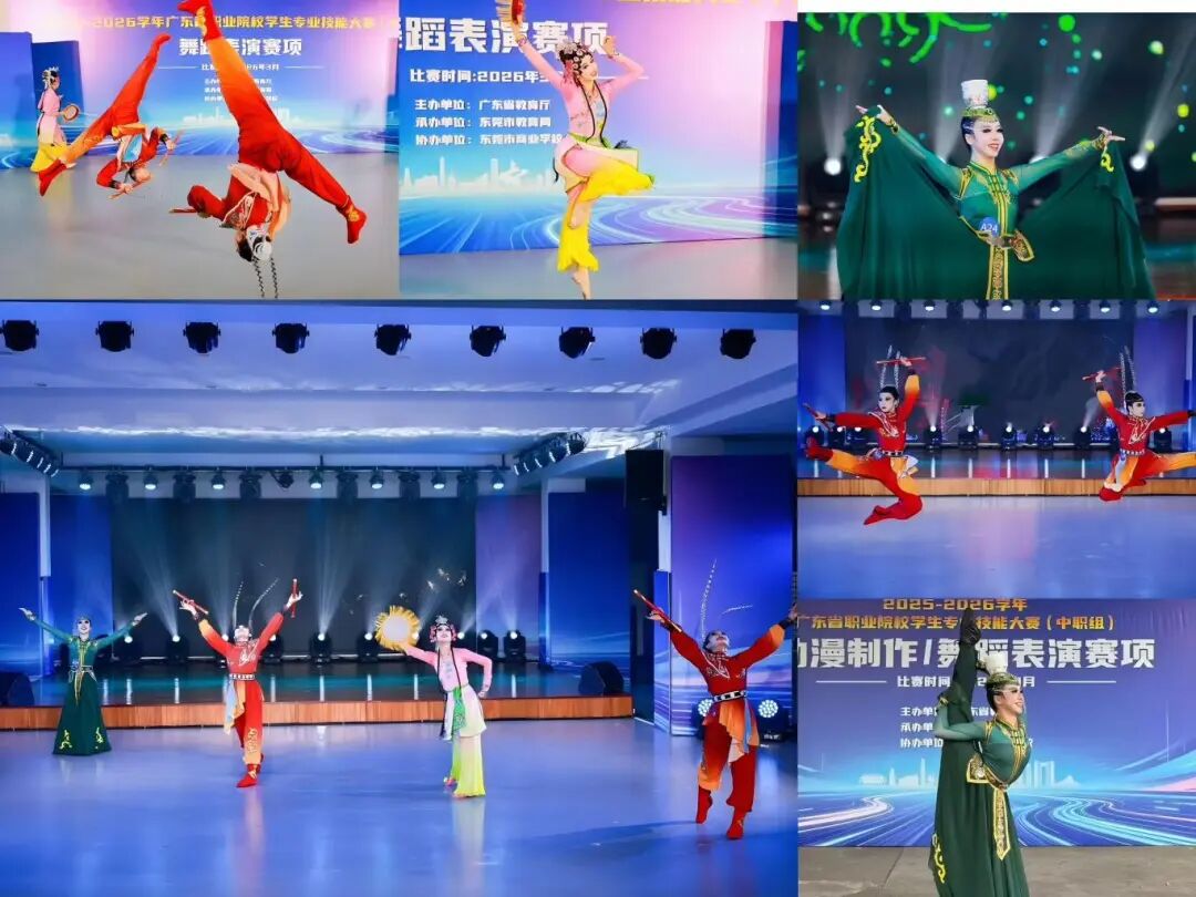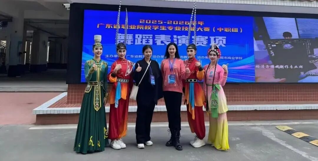 3月8日至10日,东莞市商业学校内舞影翩跹,“舞蹈表演”赛项汇聚了全省51支代表队、200多名舞蹈精英。在这场高水平的较量中,我校音乐舞蹈教学部主任吴绚婷担任领队,与指导教师王渠音一同带领杨思灵、洪卓淇、洪卓涵、刘淑蓉四位同学惊艳亮相。