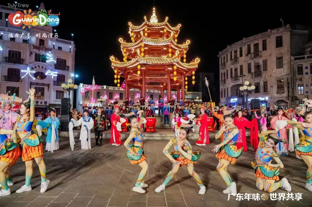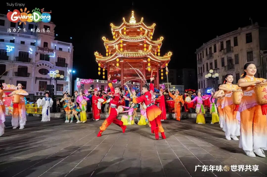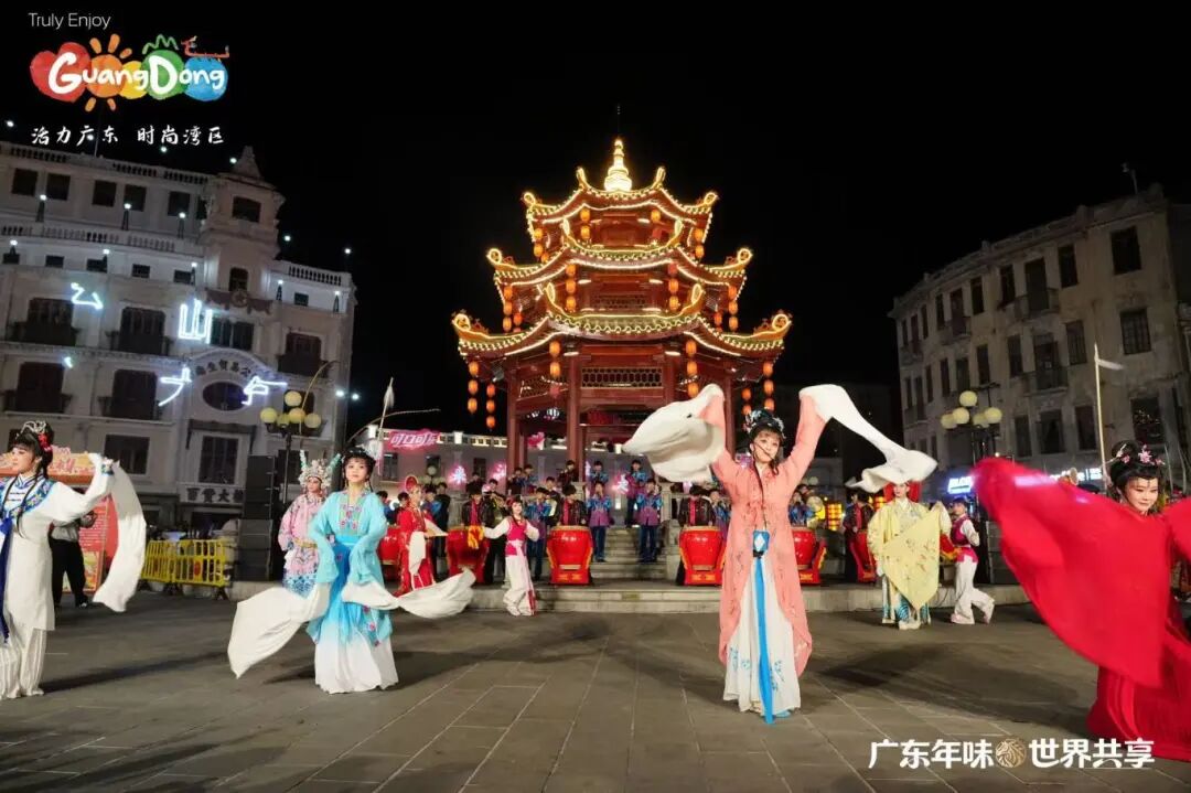 晚上,“广东年味·世界共享——请到广东过大年”新春活动之“小公园·大团圆”文艺快闪表演活动,在汕头市小公园中山纪念亭热烈上演。这是白天“请到广东过大年”主活动的延续和重要组成部分,与白天在主会场(镇邦美食街)的启动仪式和体验活动相比,这场晚间快闪更侧重于文艺表演、跨文化互动和情感升华,活动以快闪节目《潮聚·向汕》开场,这是一个沉浸式快闪,将英歌舞、潮剧、潮乐、潮汕民间舞蹈等传统潮汕非遗元素与现代快闪形式进行结合;第二个节目是由本土歌手李绪杰与两位外国友人同台演唱了《我爱潮汕小吃》,歌曲将潮汕美食的烟火气与跨文化交流的精彩瞬间融为一体;学校潮州音乐学生还表演了潮汕大锣鼓《火炮锣鼓乐》等;尾声,所有外国友人与演艺人员齐聚小公园的百货大楼前。在激光光影的映照下,“请到汕头过大年”的美好邀约被投射出来,众人共同定格了一张象征“小公园大团圆”的温馨合影,将活动气氛推向高潮,用光影定格的“大团圆”。活动由音乐舞蹈教学部主任吴绚婷担任总导演,舞蹈专业教师陈理扬担任执行导演,王渠音、黄嘉俊、陈国权、李晓帆、林炜豪、袁晓虹、倪烁扬、许悦涵、姚锶茜、周积明担任指导教师,陈树泉、姚立负责服装、道具工作。
